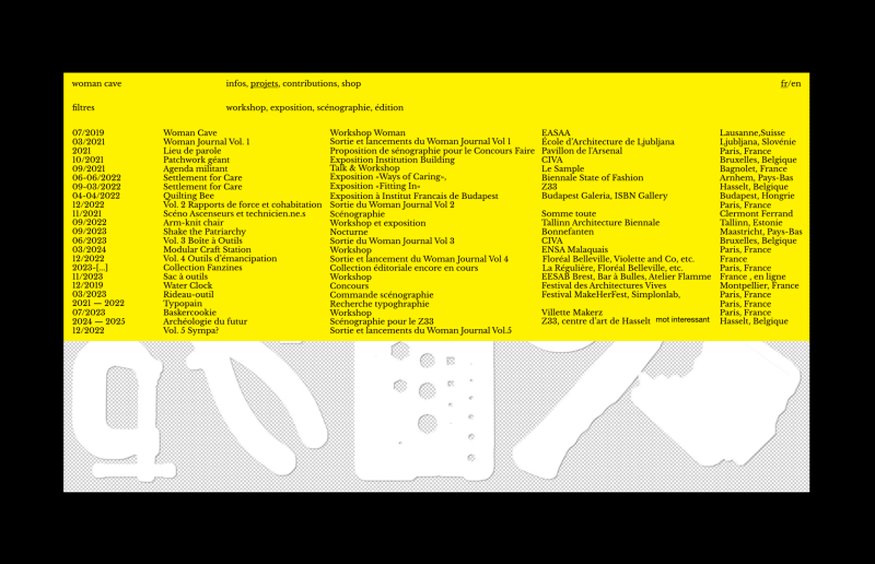 Woman Cave is a multidisciplinary collective that explores gender-related issues in inhabited spaces. It operates as a design and architecture studio, publishes a biannual magazine titled Woman Journal, and also takes part in exhibitions while organizing workshops.